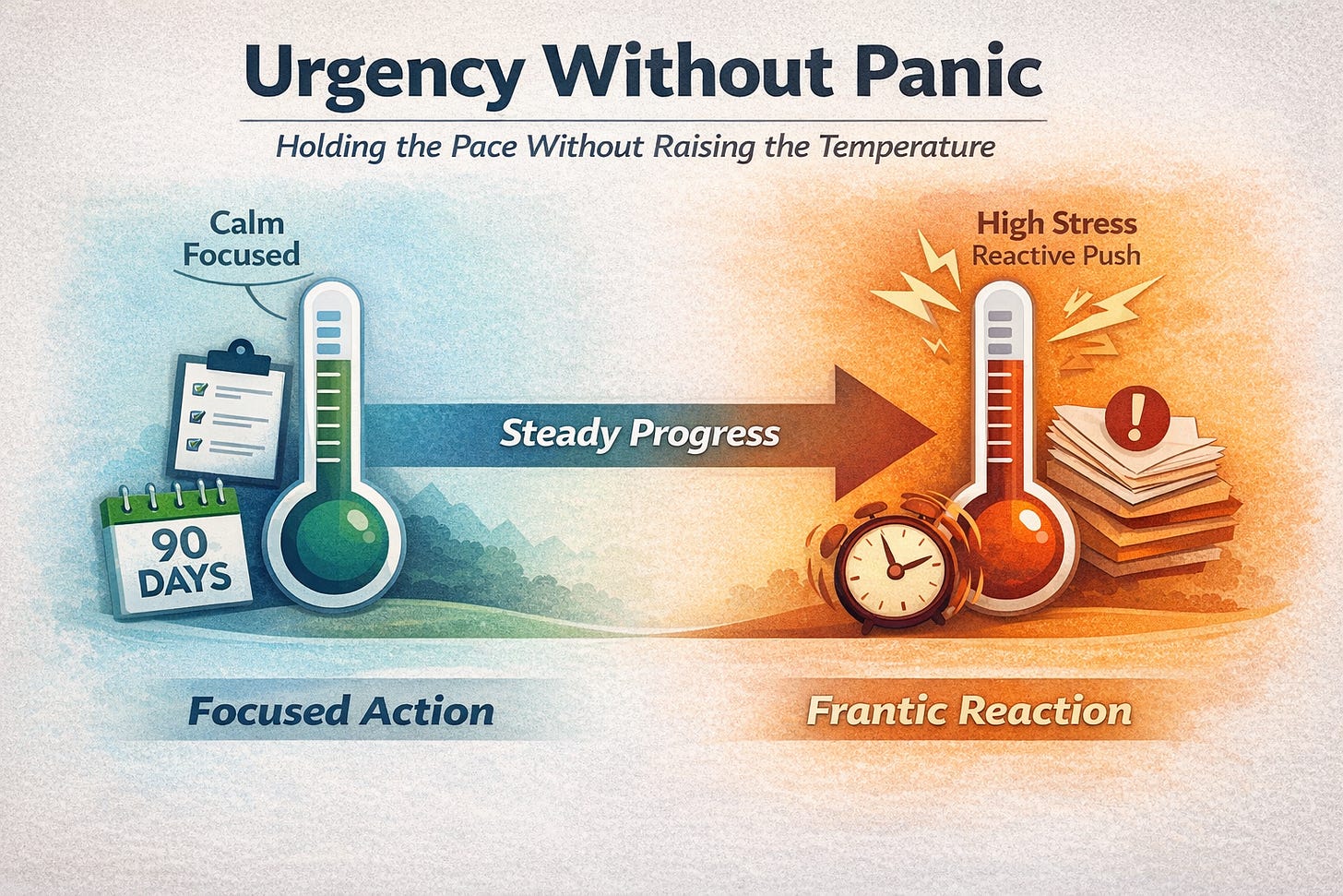 Urgency without panic is a leadership discipline. It is the ability to move decisively without destabilizing the people doing the work. It is central to effective 90-day cycles because short timelines demand momentum, but momentum only sustains when people feel grounded.